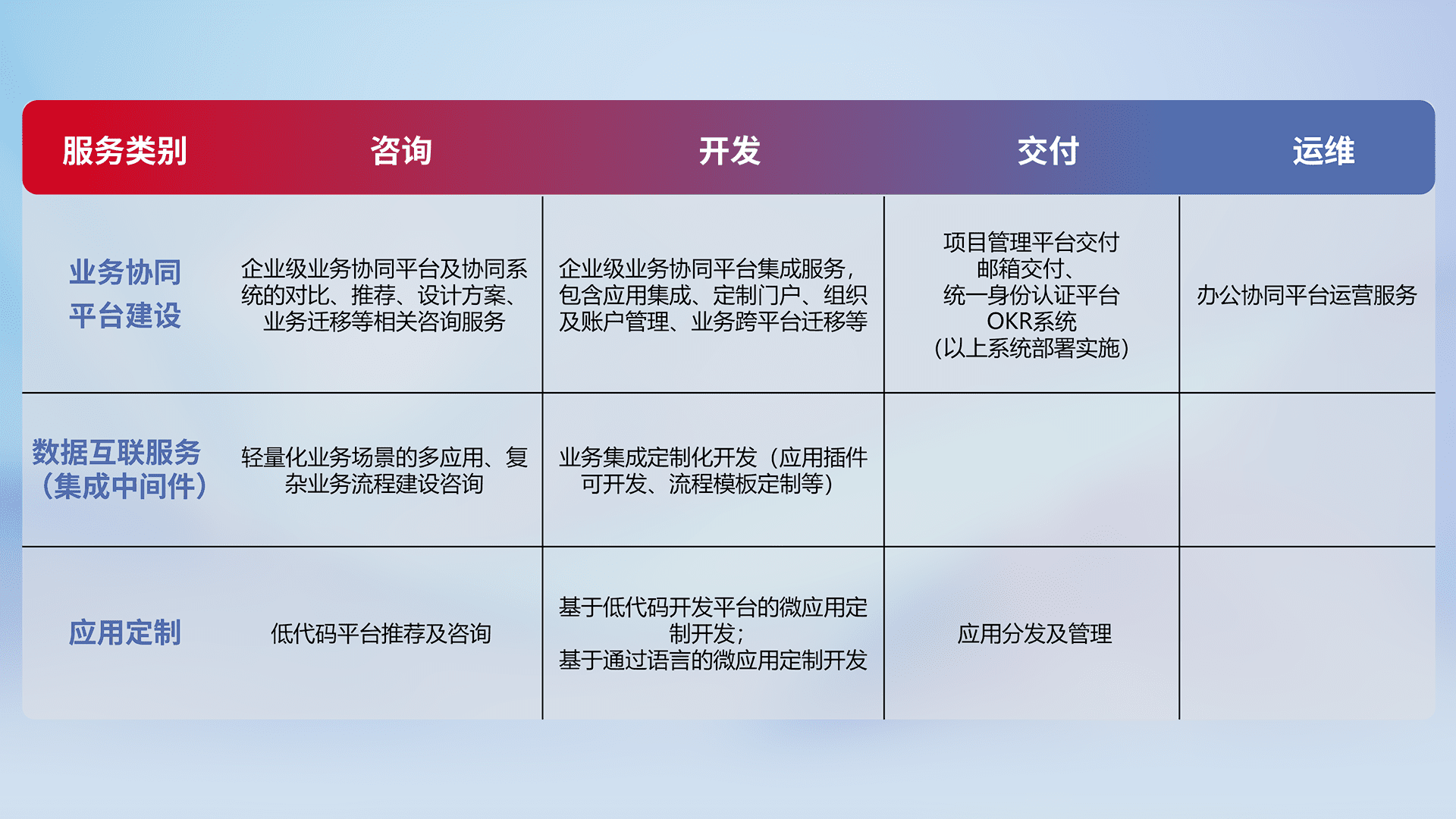 针对钉钉、、、企微、、、、IDaas等平台级产品提供产品的规划、、方案、、、交付、、、定制化开发等服务,,,,实现如统一协同办公、、、、智能客户服务、、混合会议管理、、智能数据查询、、等业务场景,,实现数字化转型。。。。